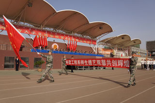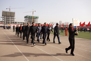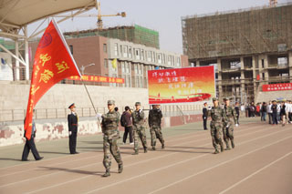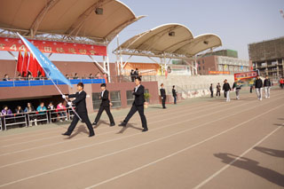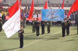 上午8時,伴隨著運動員進行曲明快激揚的節(jié)奏,儀仗隊、裁判員代表隊、各班級運動員、教師方隊依次入場。
