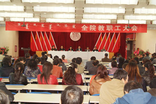 大會由學(xué)院常務(wù)副院長董平主持。學(xué)院黨委副書記、紀(jì)委書記白托婭,副院長孫恒,副院長武鈞,黨委委員、科研處處長李宏,黨委委員、教務(wù)處處長趙志蒙出席會議,200多名教職工參加大會。